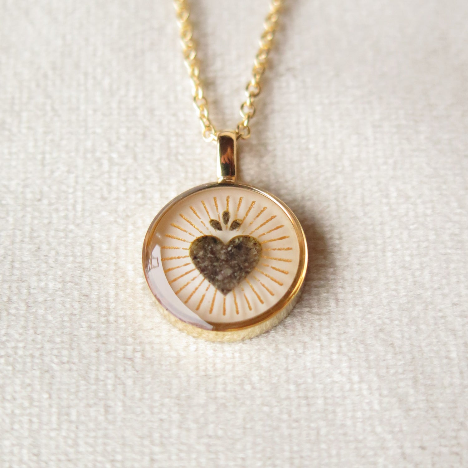 In diesem Anhänger ist die Asche in Form von Herzchen, dem Namen und einem Infinty-Symbol gebracht.