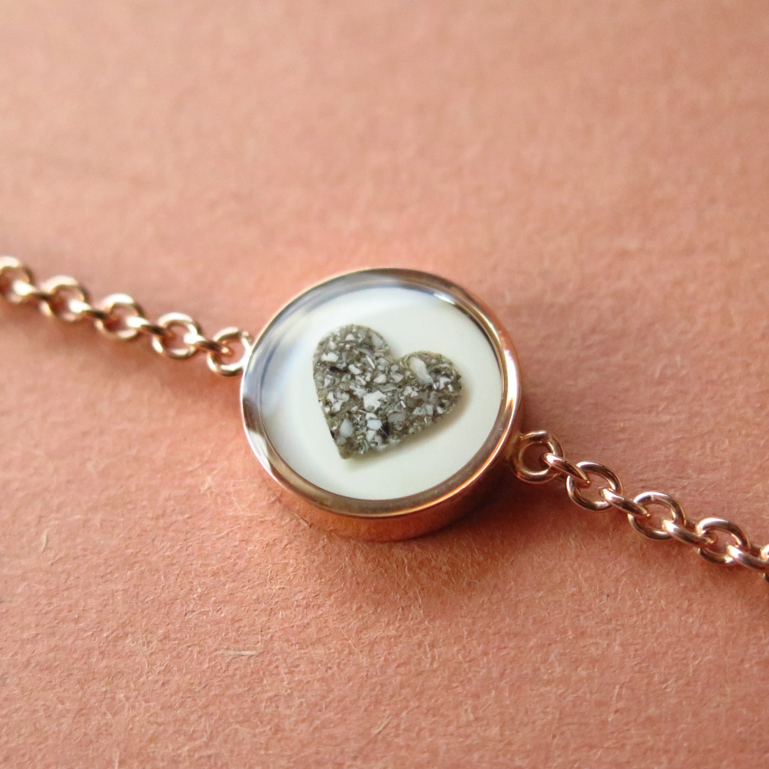 In diesem Schmuckstück ist ein Herz aus dem Fingerabdruck in Rosé/Gold in der Mitte. Das Herz außen rum besteht zu einer Hälfte aus Haar und die andere Hälfte besteht aus Asche.